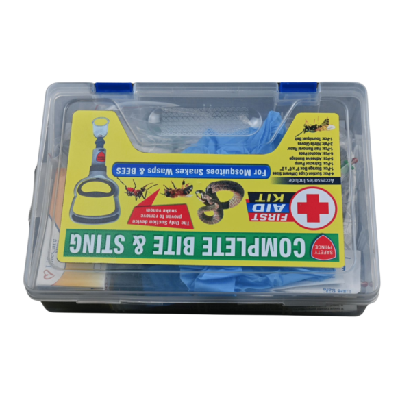 Contains essential medical supplies: bandages, antiseptic wipes, plasters, scissors, and more
